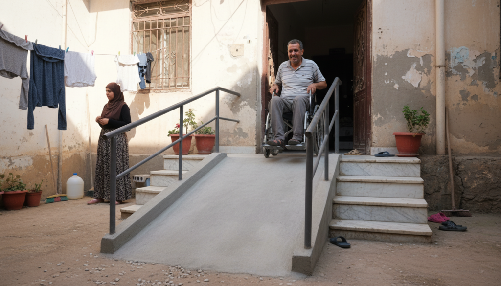 تمهيد مداخل المنازل وعمل «منحدرات» (Ramps) ومقابض مساعدة، لضمان استقلالية الحركة للشخص ذوي الإعاقة الحركية داخل بيئته المعيشية.