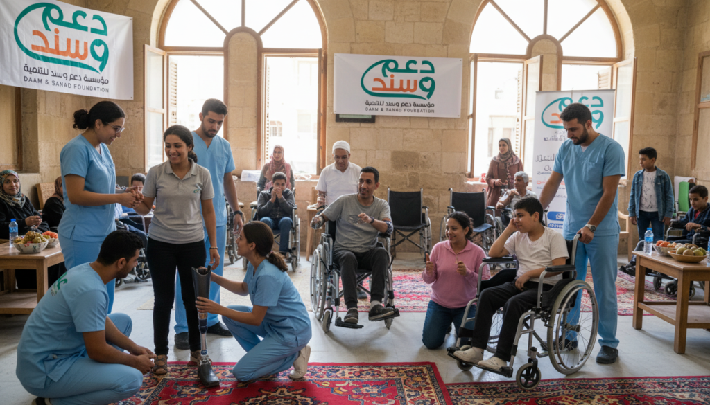 وحدة الأطراف الصناعية والأجهزة التعويضية: توفير أطراف صناعية عالية الجودة، كراسي متحركة، ودعامات حركية لمساعدة المصابين على استعادة
